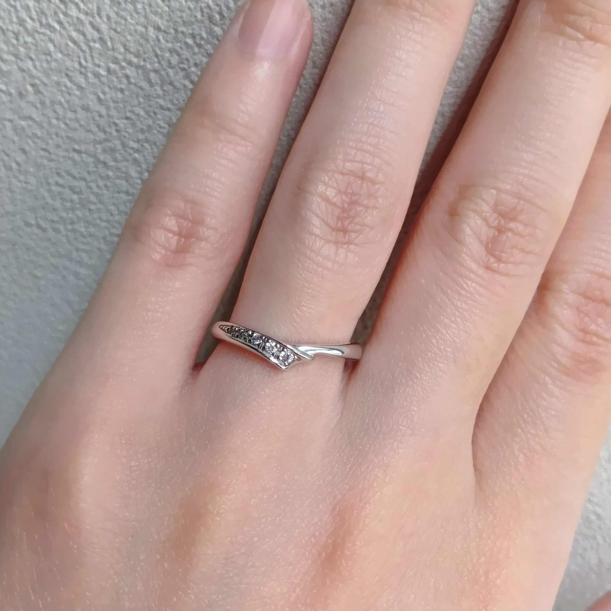 どんな時もふたりが手と手を繋いで喜びを分かち合えるように、と願いが込められたマリッジリング(結婚指輪)。強く結ばれたラインに流れ込むダイヤモンドで喜びを表現しました。左右の幅の違いがよりデザインを際立たせ、メリハリのついたV字のデザインは手元をすっきりと見せてくれます。こぼれ落ちるようにセッティングされたダイヤモンドが美しく輝き、立体感のあるデザインは陰影を利用してより印象的に。光の角度で表情を変え、可愛らしくも、格好良くもお使い頂ける万能リングに仕上げました。