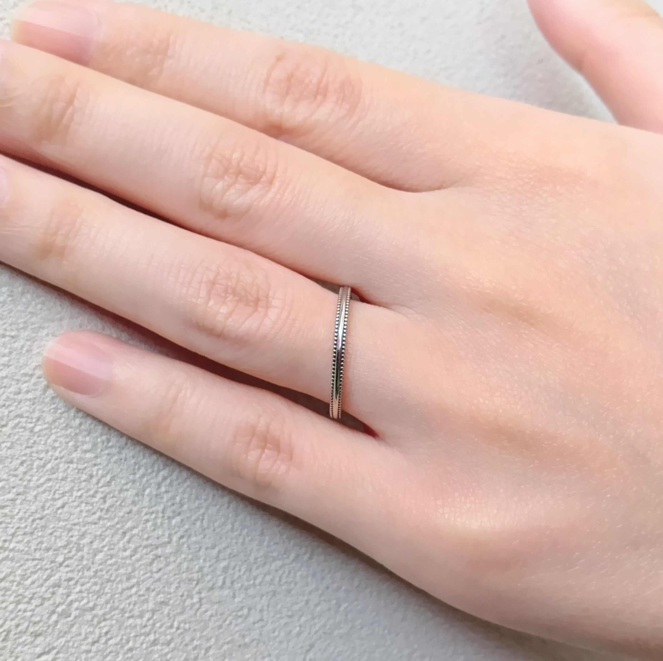 一周続く繊細なミル打ち加工はおふたりの永遠の絆を連想させる。ミル打ち以外にあえてデザインを入れず、均等に施されたまさに職人技の光る加工を存分に楽しめるマリッジリング(結婚指輪)。ミル打ちの繊細さを引き立てる細身のシルエットもまた抜群に格好良い。