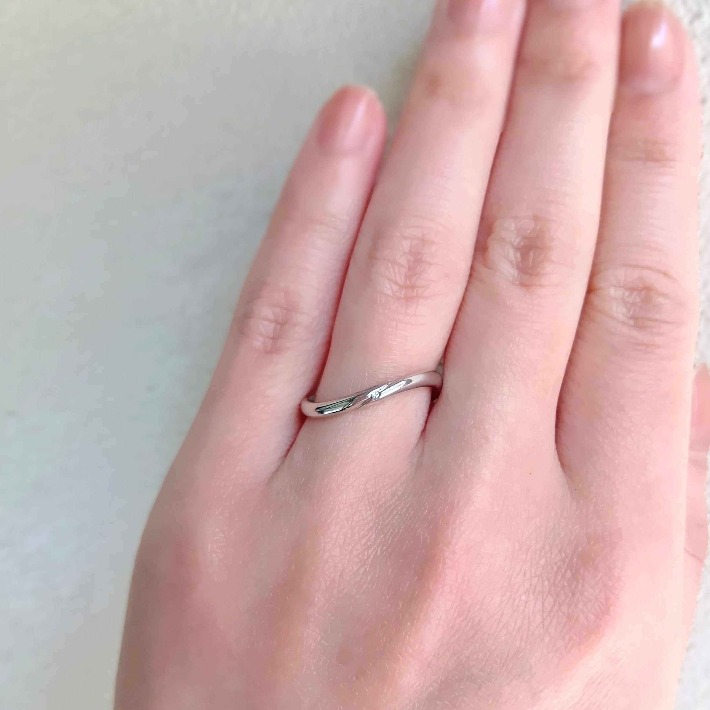 指に着けた時の繊細なラインが大人っぽさを演出。飽きのこないシンプルなタイプのマリッジリング(結婚指輪)です。S字のラインは指馴染みが良いので、普段使いされる方にオススメです。特に強めのS字ラインは、指を細く長く見せる効果も!!センターに入ったラインが、光が当たる事により様々な表情を見せてくれます。女性用にはワンポイントでダイヤモンドをセッティング。日常の中で、さりげなく輝きます。つや消し加工などのアレンジを入れたい方にもオススメ!!