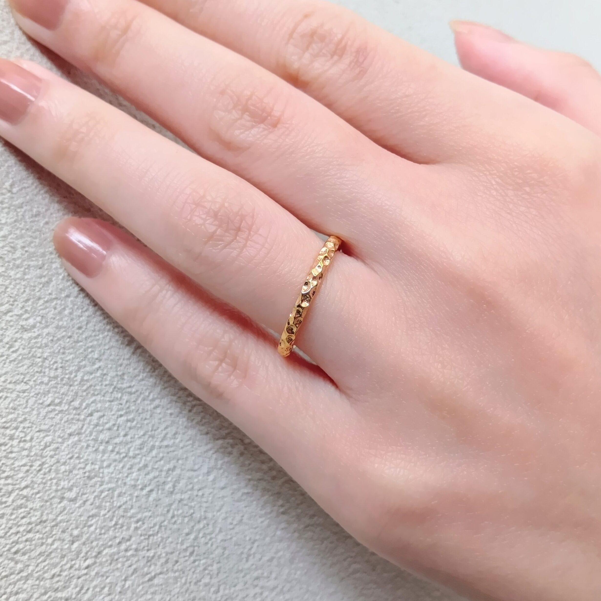 表面のおうとつあるデザインが格好良い個性派マリッジリング(結婚指輪)。特徴的なデザインはリング幅が太いと着ける人を選びがちなので、あえて細身にデザインし、ゴツくならず且つデザインも主張する大人っぽい仕上がりに。おうとつを付けるために厚みも必要になるところ、リング幅を細くすることで厚みによる指当たりも軽減。手の平側まで一周続く模様は永遠に続く互いへの深い愛情も表現している。