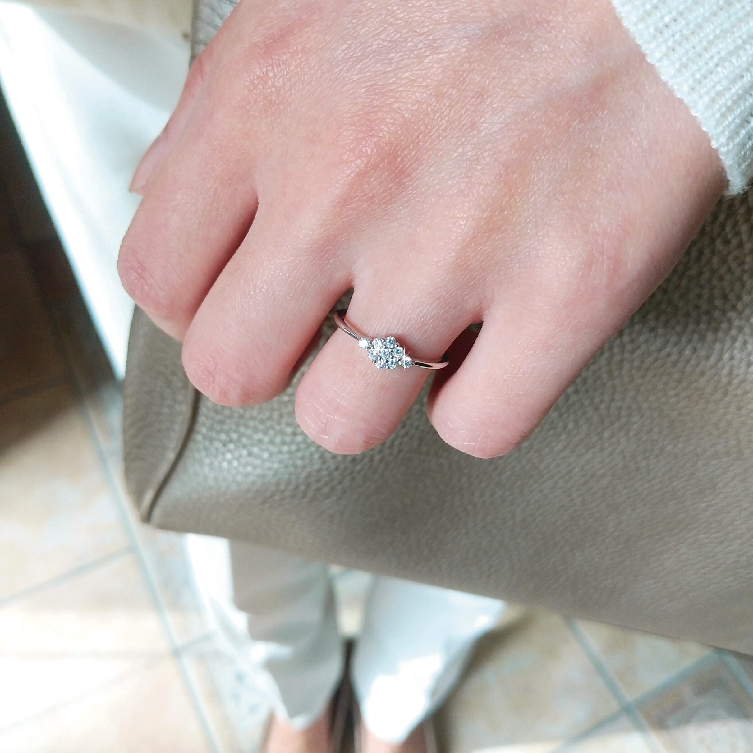 ダイヤモンドで形作られたお花のモチーフの両サイドにもメレダイヤモンドをあしらった、華やかでキュートな婚約指輪(エンゲージリング)。遠くから見ると、9石のダイヤモンドがまとまって一つの大きなひし形の形となり、より強い輝きを放つ。引っ掛かりが無いように、リングの厚みを抑えたデザインだから、ダイヤモンドの存在感と実用性の両方を兼ね備えている。幸せに満ち溢れたふたりの未来を祝福する、ダイヤモンドの輝きが美しいリング。
