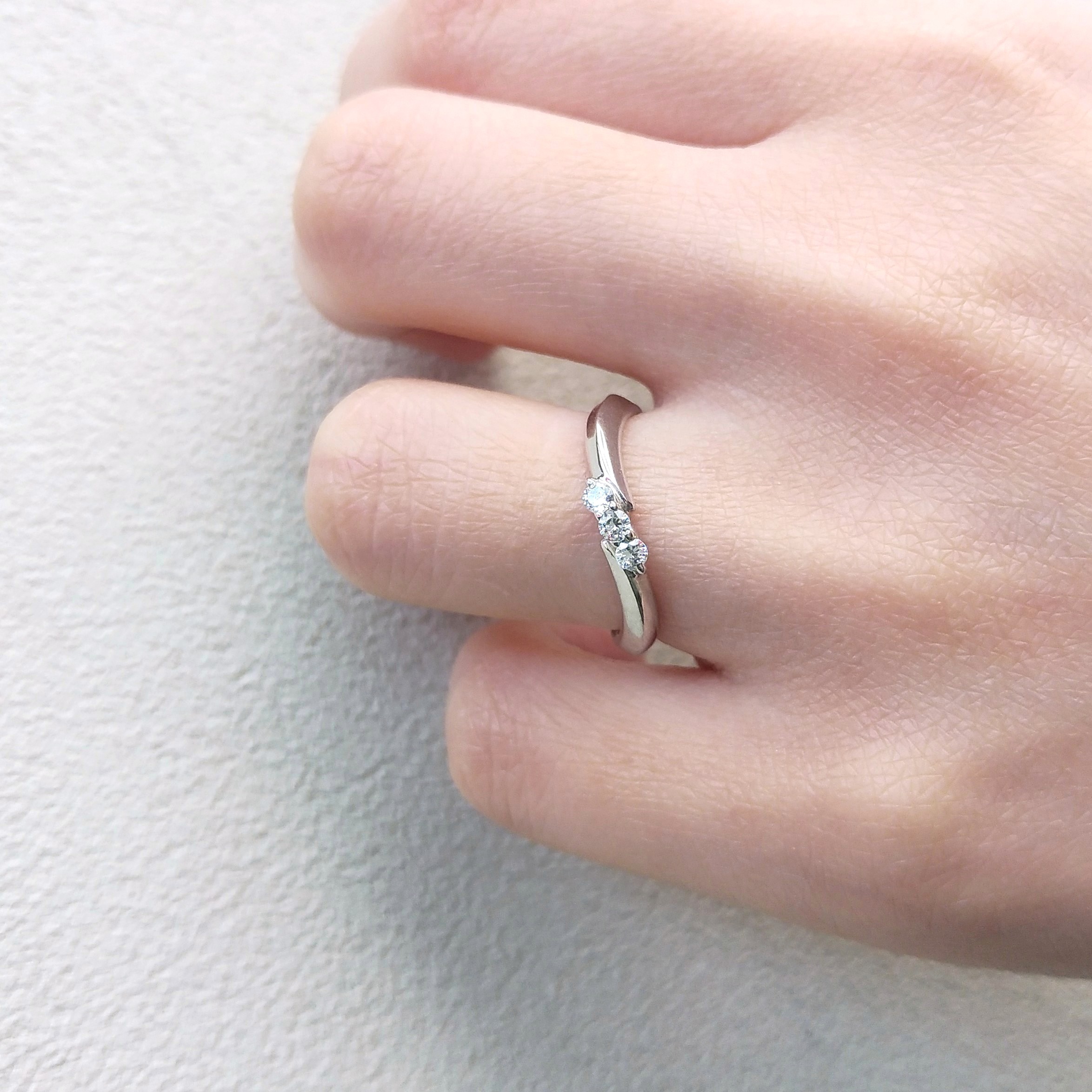 とびきりの笑顔と優しさが幸せを運んできてくれる。ふたりのもとへ幸せを運ぶ緩やかな流れを美しい曲線で表現したマリッジリング(結婚指輪)です。女性用は寄り添うように留まったダイヤモンドが幸せな時を表わし、男性用は女性を包み込む優しさや強さを表現しています。力強くも優しい印象のデザインは、見るたびに幸せを感じさせてくれる。ほどよいボリューム感で高級感を出しつつ、緩やかなウェーブが、包み込むような優しい着け心地を叶えました。