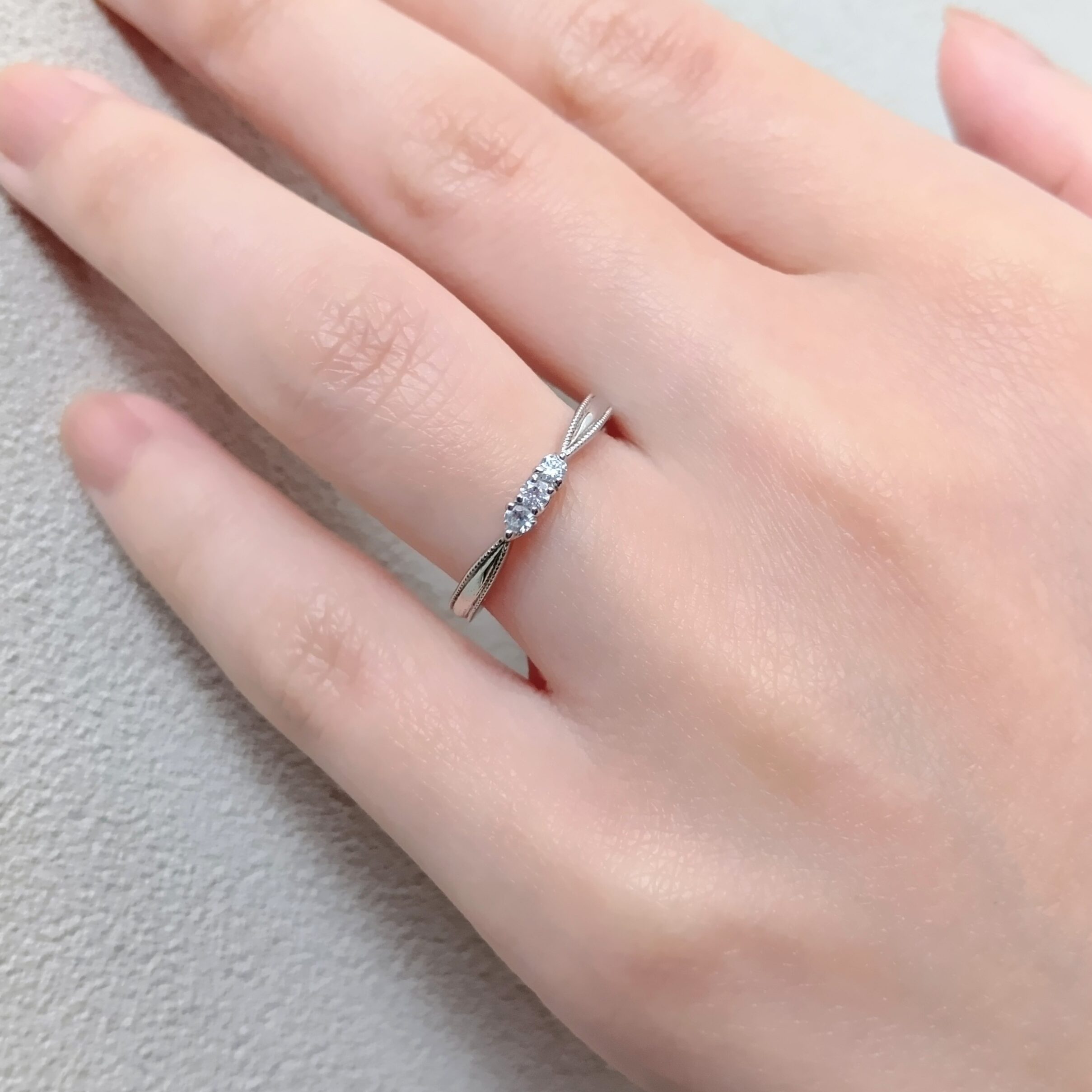 ふたりだからこそ結ばれた、固い絆を表現したマリッジリング(結婚指輪)です。女性用は中央のダイヤモンドを際立たせるため絞りのあるデザインで「結び目」をイメージ。センターのダイヤモンドで可愛らしさを出しつつ、エッジの効いたデザインでエレガントな女性を演出してくれる大人可愛いリング。