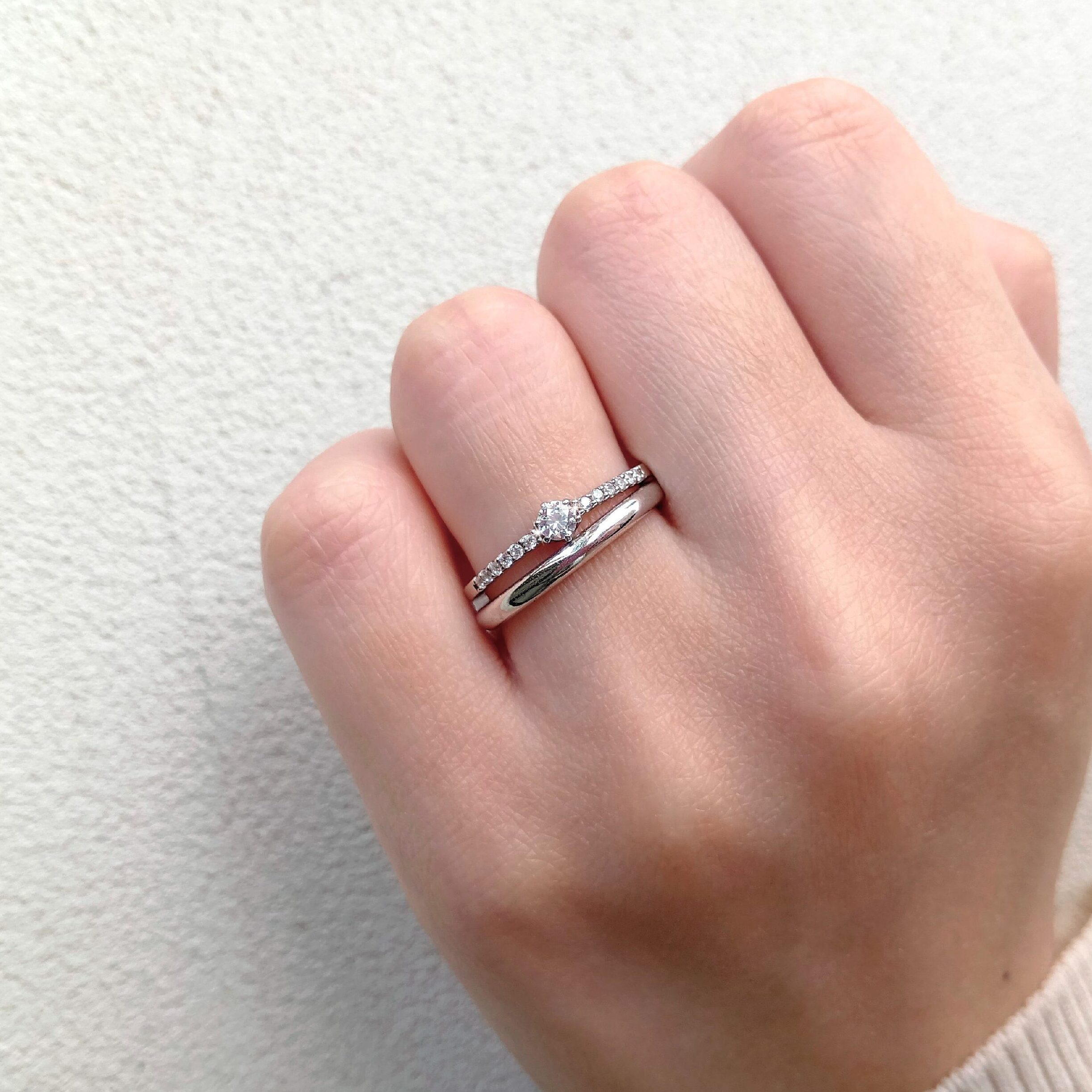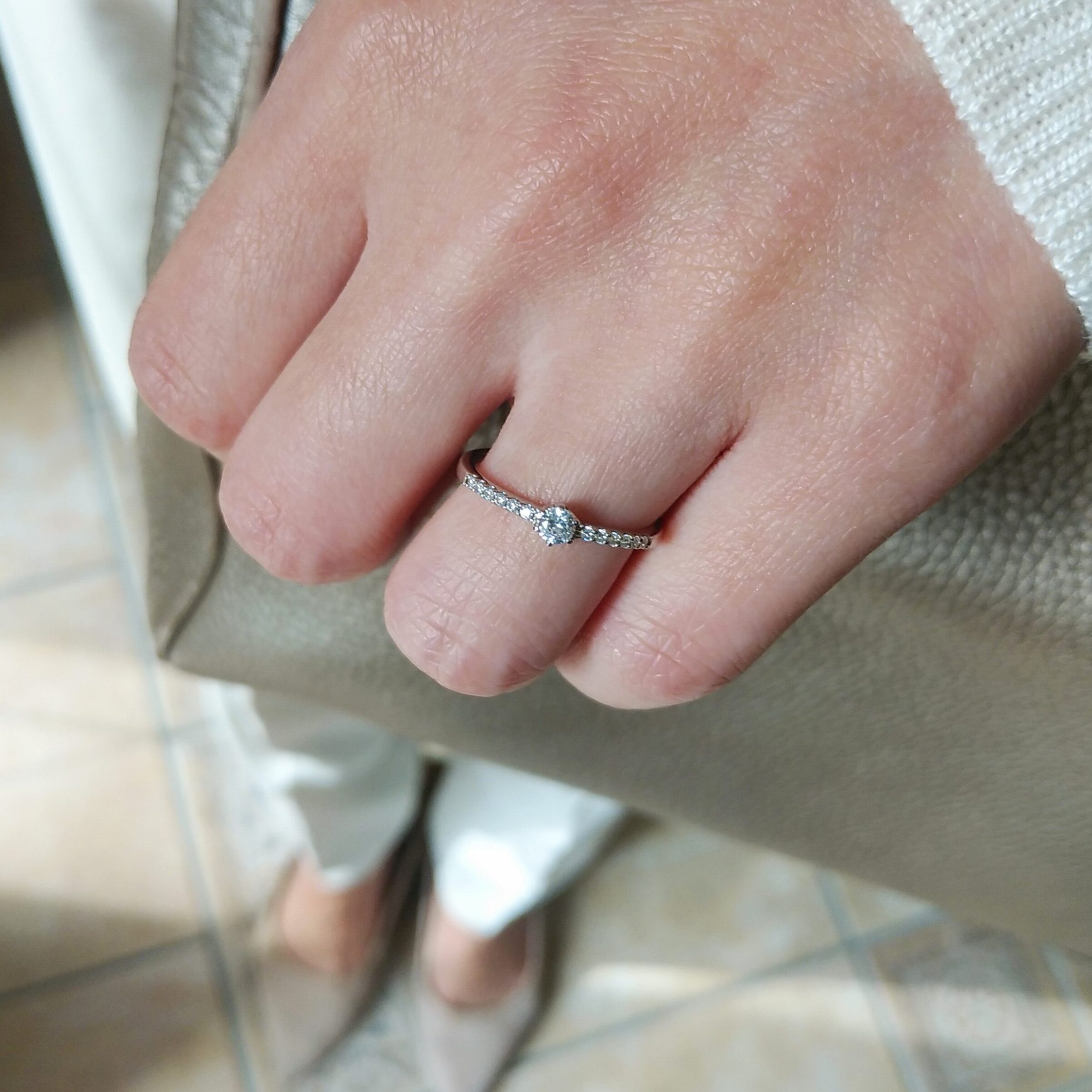 キラキラは好きだけど、ゴージャスにはしたくない・・・そんな花嫁の声に応えて生まれた、細身で、高さも抑えて目立ち過ぎず、かつ華やかで特別感もしっかりある婚約指輪(エンゲージリング)。一列に並ぶダイヤモンドは、ふたりのこれまでの大切な思い出と、これからも続く輝かしい未来を表現。指輪を目にする度に、ふたりの軌跡が蘇り、幸せな気持ちに!