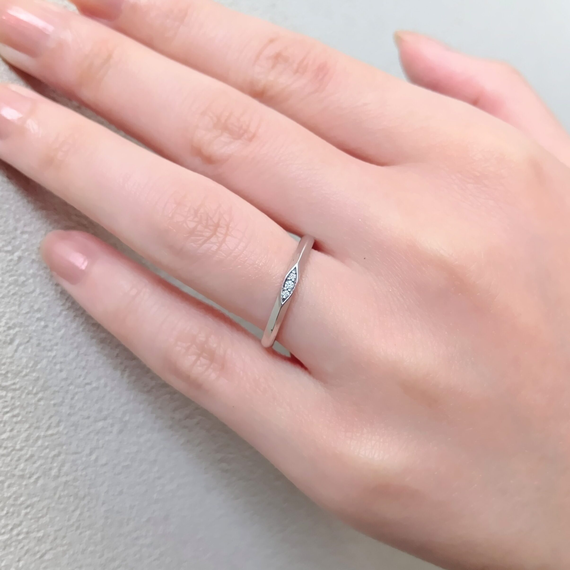 直線的なラインを意識したクール系デザインのマリッジリング(結婚指輪)。リングの中心に山型にエッジを効かせることにより、地金の光沢感と影の美しさを演出。女性用デザインにはセンターのメレダイヤモンドの輝きもプラスされ、オシャレ度がUP!ボリュームが出るとかっこよくなりすぎてしまう存在感のあるデザインは、あえて細身で魅せるのが大人っぽい。ファッションリング感を出しつつも、シンプルで上品な雰囲気も出せるので、おしゃれに着けこなしたいカップルにおすすめ!